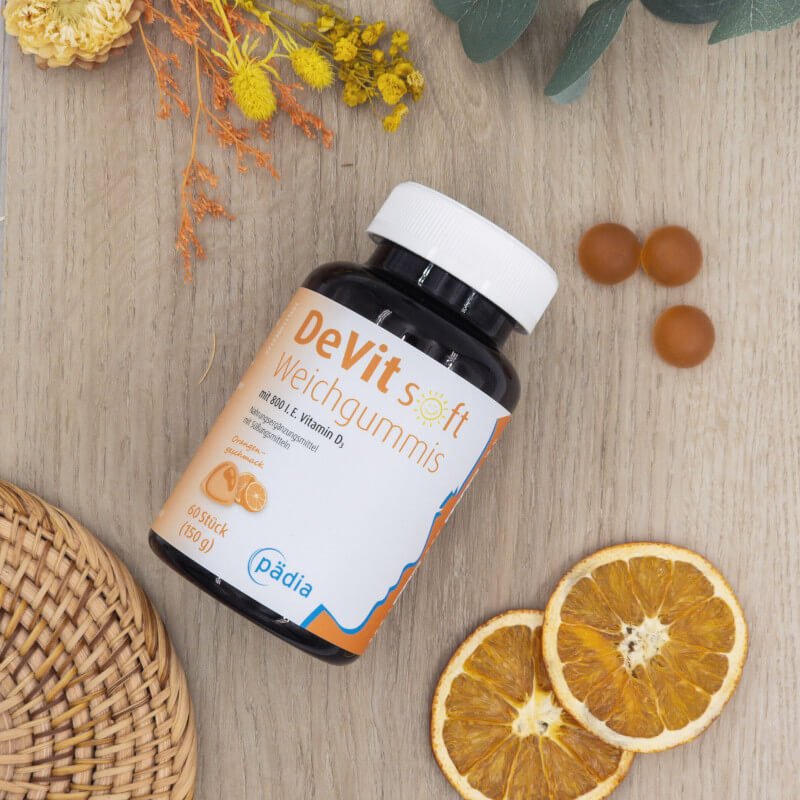 Eine Flasche der DeVit soft Weichgummis mit Vitamin D3 von pädia liegt auf einem Holztisch, dekoriert mit getrockneten Orangenscheiben und Blüten.