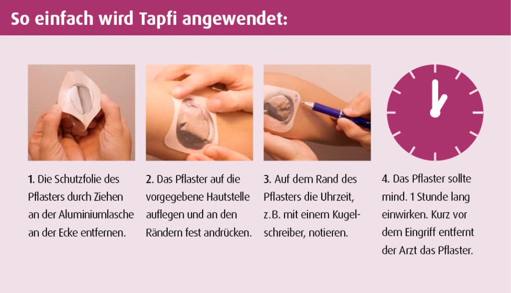 Kurz vor der Impfung wird das Tapfi-Pflaster vom Kinderarzt bzw. Arzt wieder entfernt. Die Einstichschmerzen und das unangenehme Druckgefühl bei der Impfung werden wirksam verringert.